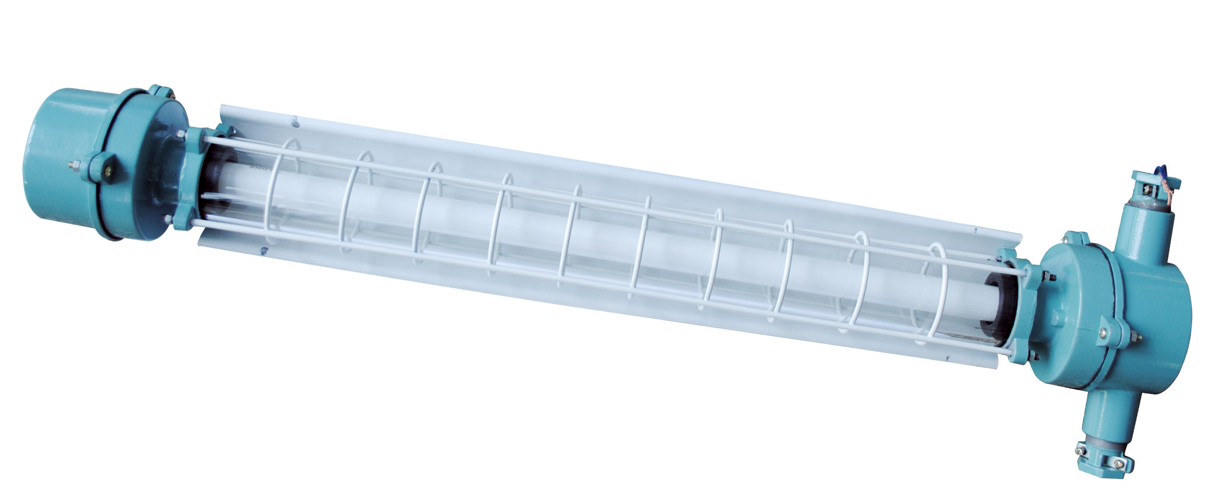 熒光燈由前燈體、后燈體及光源、防爆玻璃罩、金屬防護(hù)罩等部分組成。前燈體由鋁合金外殼、蓋、啟輝器、插座等部分組成,前端蓋上設(shè)有電纜引入裝置和外接地螺釘。后燈體由鋁合金殼、蓋、鎮(zhèn)流器、插座等部分組成。光源腔與接線腔,燈具內(nèi)腔與外界均有符合規(guī)定的防爆接合面防爆。 |